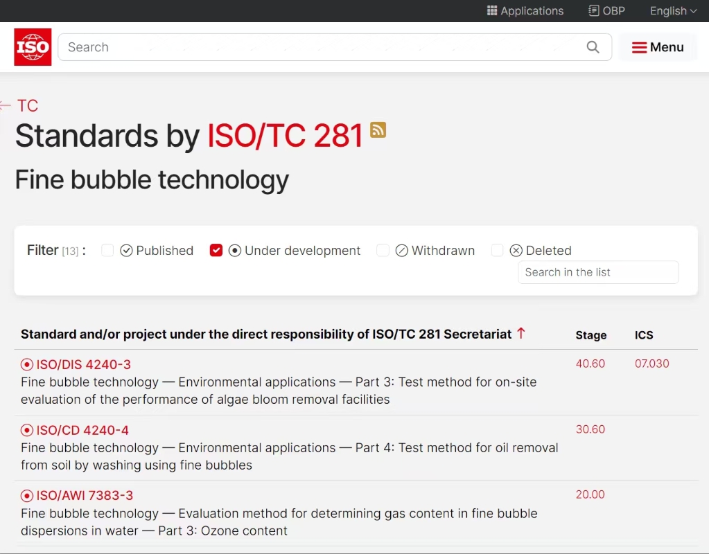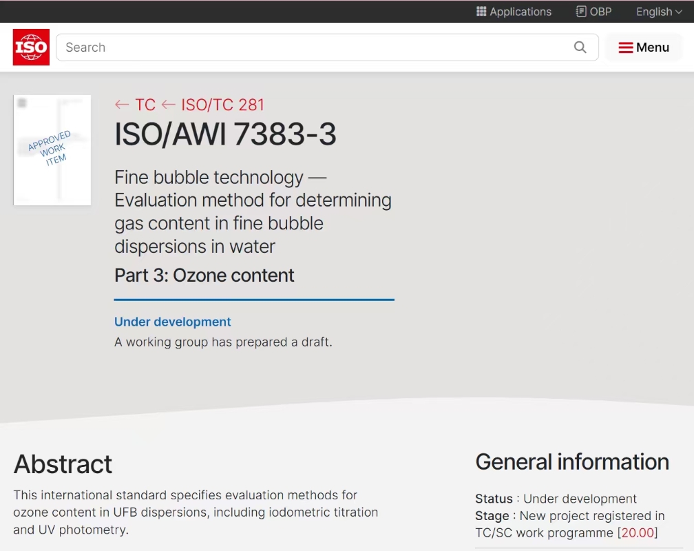 該國際標(biāo)準(zhǔn)屬于前沿技術(shù)領(lǐng)域,對水中納米級別的超微細氣泡分散體系中臭氧含量的評估方法進行了規(guī)定。微細氣泡和超微細氣泡技術(shù)與臭氧化技術(shù)相結(jié)合,可提高臭氧的溶解性和氧化能力,應(yīng)用領(lǐng)域包括廢水深度處理、水電站水體環(huán)境治理等。